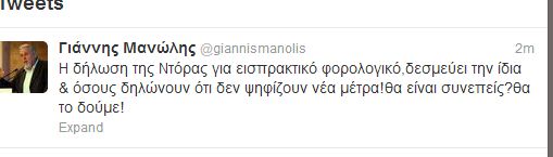 “Η δήλωση της Ντόρας για εισπρακτικό φορολογικό, δεσμεύει την ίδια & όσους δηλώνουν ότι δεν ψηφίζουν νέα μέτρα! θα είναι συνεπείς? θα το δούμε!”, ήταν το σχόλιο του Γιάννη Μανώλη.
