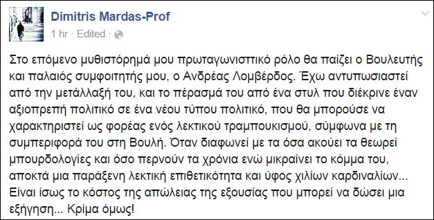 Επίθεση στον βουλευτή του ΠΑΣΟΚ Ανδρέα Λοβέρδο εξαπέλυσε μέσα από τον λογαριασμό του στο facebook ο Δημήτρης Μάρδας.