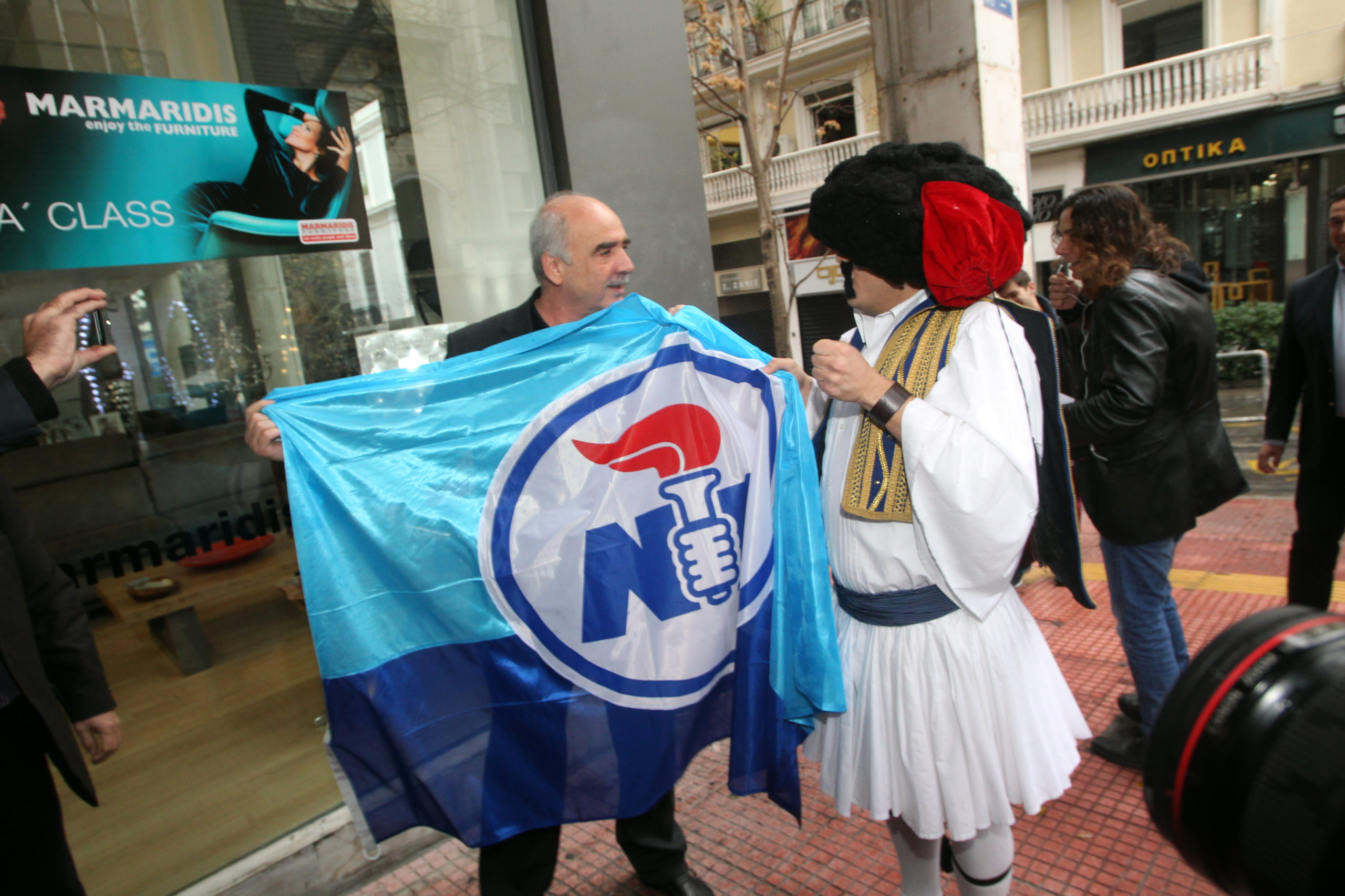 Τη σημαία που του έδωσε ο τσολιάς της Ελληνοφρένειας ξεδίπλωσε ο υποψήφιος πρόεδρος της ΝΔ Βαγγέλης Μεϊμαράκης έξω από το εκλογικό κέντρο στο ΕΒΕΑ, στην ψηφοφορία για την εκλογή πρόεδρου της Νέας Δημοκρατίας