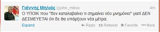 Με ανάρτηση στον προσωπικό του λογαριασμό στο twitter σχολιάζει ο Γιάννης Μηλιός την συνέντευξη που παραχώρησε ο Γιάννης Στουρνάρας στην Realnews. Ο υπεύθυνος οικονομικής πολιτικής του ΣΥΡΙΖΑ καλεί τον υπουργό Οικονομικών να δώσει διευκρινήσεις αναφορικά με το ενδεχόμενο λήψης νέων μέτρων τονίζοντας στο «τιτίβισμα» του,