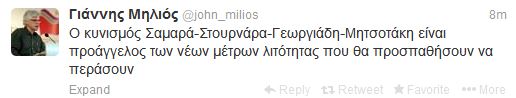 Νέα μέτρα λιτότητας δήλωσε πως θα έρθουν, μέσω του προσωπικού του λογαριασμού στο Twitter, ο βουλευτής του ΣΥΡΙΖΑ, Γιάννης Μηλιός. Ο υπεύθυνος οικονομικής πολιτικής του ΣΥΡΙΖΑ, επισήμανε πως ο «κυνισμός» του πρωθυπουργού και του Στουρνάρα, του Γεωργιάδη και του Μητσοτάκη, είναι «προάγγελος» νέων μέτρων λιτότητας που θα έρθουν στην χώρα.