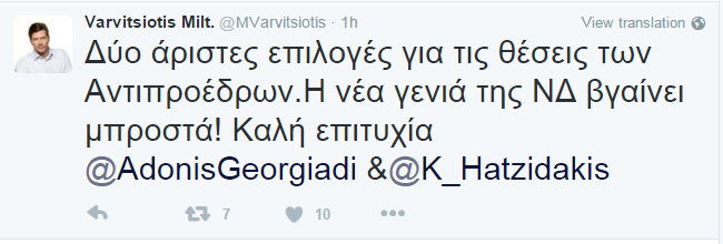 Την απόφαση του Προέδρου της Νέας Δημοκρατίας, Κυριάκου Μητσοτάκη για τον ορισμό των αντιπροέδρων του κόμματος σχολίασε ο Μιλτιάδης Βαρβιτσιώτης με ανάρτηση στον προσωπικό του λογαριασμό στο Twitter, επισημαίνοντας ότι “η νέα γενιά της ΝΔ βγαίνει μπροστά”.