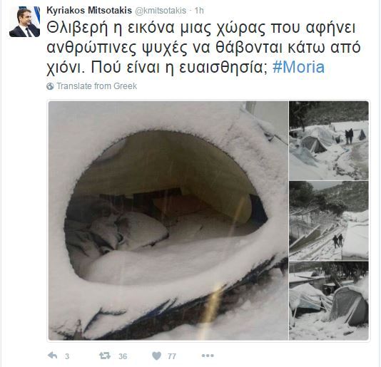 Επίθεση στην Κυβέρνηση για την κατάσταση που επικρατεί λόγω χιονιά στη Μόρια εξαπέλυσε μέσω ανάρτησής στον λογαριασμό του στο Twitter ο πρόεδρος της Νέας Δημοκρατίας, Κυριάκος Μητσοτάκης.