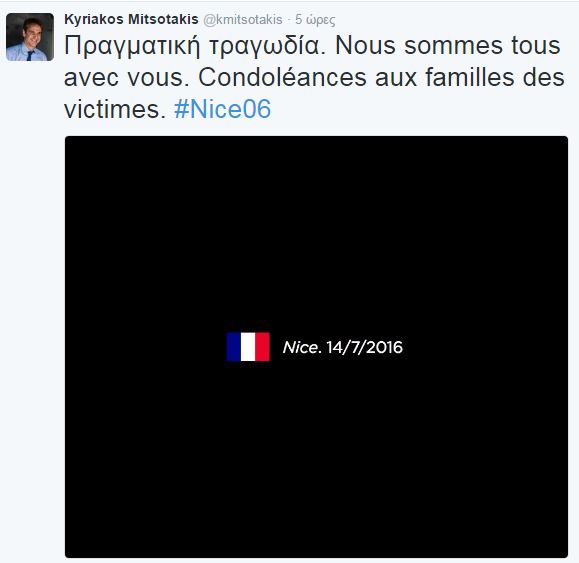 Τη θλίψη του για τη νέα πολύνεκρη επίθεση που σημειώθηκε το βράδυ της Πέμπτης στη Νίκαια της Γαλλίας, εξέφρασε ο Πρόεδρος της Νέας Δημοκρατίας, Κυριάκος Μητσοτάκης, με ανάρτησή του στο Twitter.