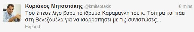 “Του έπεσε λίγο βαρύ το ίδρυμα Καραμανλή του κ. Τσίπρα και πάει στη Βενεζουέλα για να ισορροπήσει με τις συνιστώσες…”, έγραψε στο twitter ο Κυριάκος Μητσοτάκης.
