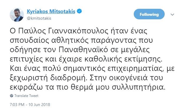 “Ο Παύλος Γιαννακόπουλος ήταν ένας σπουδαίος αθλητικός παράγοντας που οδήγησε τον Παναθηναϊκό σε μεγάλες επιτυχίες και έχαιρε καθολικής εκτίμησης”, αναφέρει σε ανάρτηση του στον προσωπικό του λογαριασμό στο Twitter ο Πρόεδρος της ΝΔ Κυριάκος Μητσοτάκης.