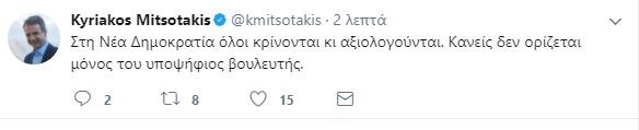 «Στη Νέα Δημοκρατία όλοι κρίνονται κι αξιολογούνται. Κανείς δεν ορίζεται μόνος του υποψήφιος βουλευτής», ανέφερε στο tweet του ο πρόεδρος της αξιωματικής αντιπολίτευσης.