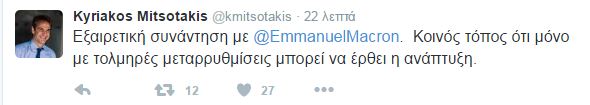 «Εξαιρετική συνάντηση με τον Εμανουέλ Μακρόν. Κοινός τόπος ότι μόνο με τολμηρές μεταρρυθμίσεις μπορεί να έρθει η ανάπτυξη», έγραψε χαρακτηριστικά ο Πρόεδρος της Νέας Δημοκρατίας, στο Twitter.