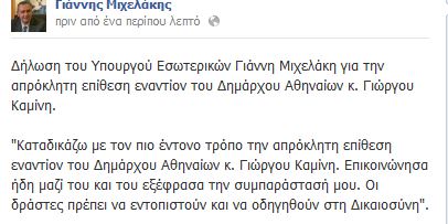 Αναφερόμενος στην επίθεση που δέχθηκε ο Δήμαρχος Αθηναίων Γιώργος Καμίνης, ο υπουργός εσωτερικών Γιάννης Μιχελάκης προέβη στην ακόλουθη δήλωση: