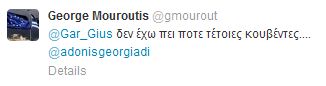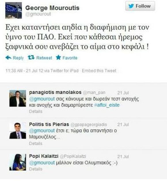 Αηδιάζει όταν ακούει τον ύμνο του Παναθηναϊκού και του ανεβαίνει το αίμα στο κεφάλι; Είναι αλήθεια ατό για τον Γιώργο Μουρούτη, στενό συνεργάτη του Αντώνη Σαμαρά και διευθυντή του Γραφείου Τύπου του Πρωθυπουργού;«Εχει καταντήσει αηδία η διαφήμιση με τον ύμνο του ΠΑΟ. Εκεί που κάθεσαι ήρεμος ξαφνικά σου ανεβάζει το αίμα στο κεφάλι», φέρεται πως έγραψε στον λογαριασμό του στο Twitter, ο Γιώργος Μουρούτης. Και ενώ το εν λόγω tweet δείχνει να έχει “εξαφανιστεί” από το timeline του, followers του απαντούν, αλλά εκείνος… το αρνείται. Δείτε τα tweets…