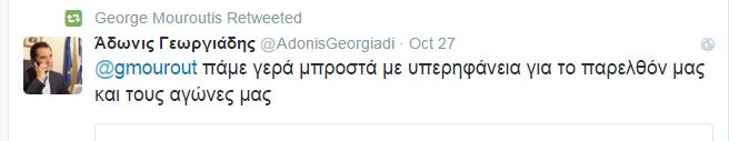 Χαρακτηριστικό ήταν και το tweet του κ. Γεωργιάδη προς τον Γιώργου Μουρούτη, το οποίο ο τελευταίος έκανε retweet. “Πάμε γερά μπροστά με υπερηφάνεια για το παρελθόν μας και τους αγώνας μας”.