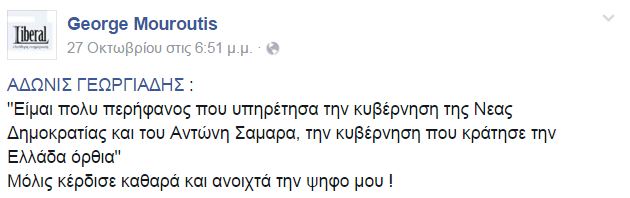 “Είμαι πολυ περήφανος που υπηρέτησα την κυβέρνηση της Νέας Δημοκρατίας και του Αντώνη Σαμαρά, την κυβέρνηση που κράτησε την Ελλάδα όρθια” έγραψε αναπαράγοντας δήλωση του κ. Γεωργιάδη.
