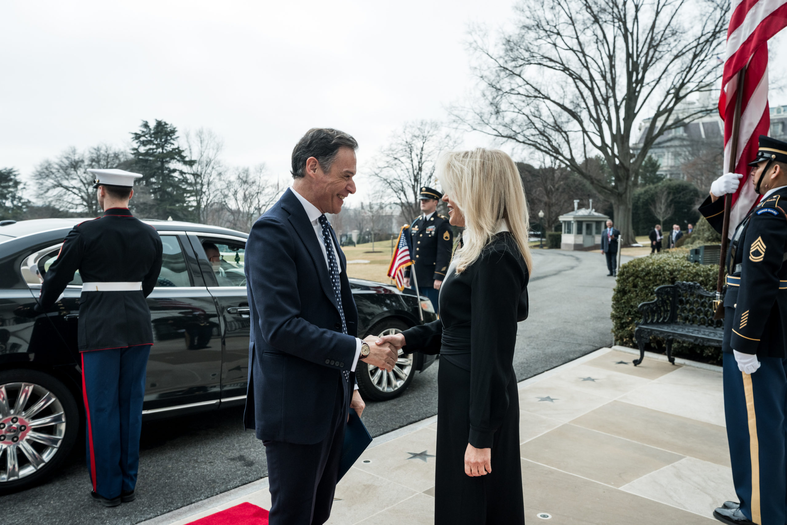 Στην είσοδο του Λευκού Οίκου τον περίμενε η Προϊσταμένη Πρωτοκόλλου του Αμερικανού Προέδρου, Πρέσβης Monica Crowley.
