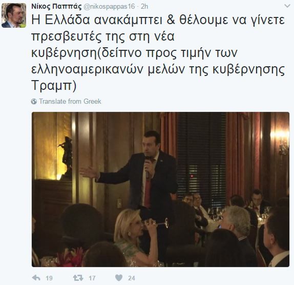 «Θέλουμε από όλους εσάς που βρίσκεστε εδώ απόψε να γίνετε πρεσβευτές της Ελλάδας», τόνισε ο κ. Παππάς, για να υπογραμμίσει: «Είναι κρίσιμο η νέα κυβέρνηση των ΗΠΑ να γνωρίζει την αλήθεια για την Ελλάδα. Να γνωρίζει ότι η χώρα μας πάει καλύτερα». «Πρέπει να κάνουμε ό,τι μπορούμε», τόνισε, «ώστε να διασφαλίσουμε πως δεν θα επικρατήσουν οι απόψεις συγκεκριμένων ευρωπαϊκών χωρών που δεν θέλουν να αποδεχθούν την ιδέα ότι η Ελλάδα επιστρέφει στην ανάπτυξη».