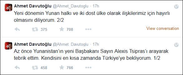 «Συγχαίρω το νέο Πρωθυπουργό της Ελλάδας και τον περιμένω σύντομα στην Τουρκία. Εύχομαι η νέα εποχή για τον ελληνικό λαό να συμβάλλει στη φιλία των δυο χωρών», αναφέρει ο «τιτίβισμα» του Τούρκου Πρωθυπουργού.