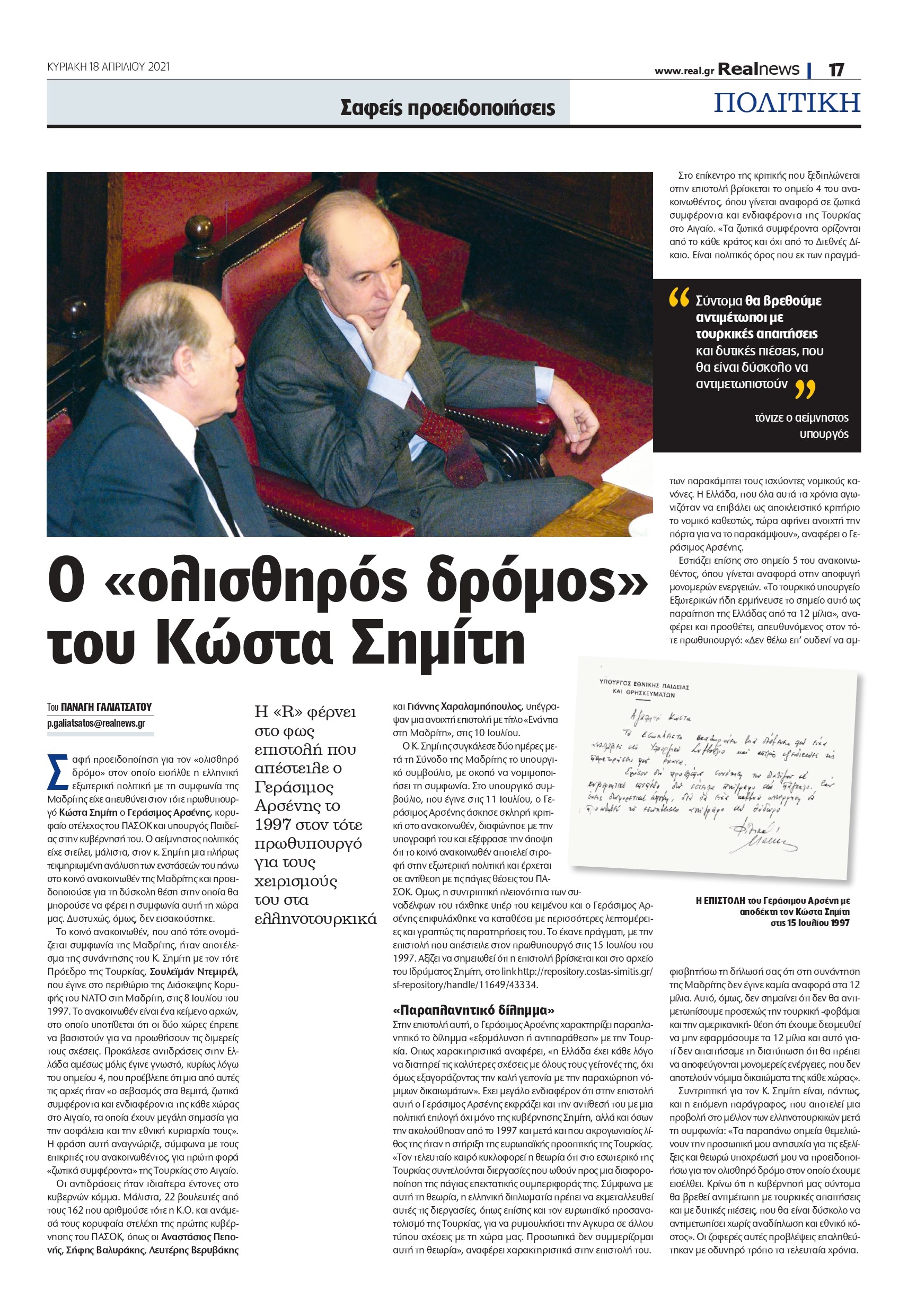 Στην επιστολή αυτή, ο Γεράσιμος Αρσένης χαρακτηρίζει παραπλανητικό το δίλημμα «εξομάλυνση ή αντιπαράθεση» με την Τουρκία. Οπως χαρακτηριστικά αναφέρει, «η Ελλάδα έχει κάθε λόγο να διατηρεί τις καλύτερες σχέσεις με όλους τους γείτονές της, όχι όμως εξαγοράζοντας την καλή γειτονία με την παραχώρηση νόμιμων δικαιωμάτων». Εχει μεγάλο ενδιαφέρον ότι στην επιστολή αυτή ο Γεράσιμος Αρσένης εκφράζει και την αντίθεσή του με μια πολιτική επιλογή όχι μόνο της κυβέρνησης Σημίτη, αλλά και όσων την ακολούθησαν από το 1997 και μετά και που ακρογωνιαίος λίθος της ήταν η στήριξη της ευρωπαϊκής προοπτικής της Τουρκίας. «Τον τελευταίο καιρό κυκλοφορεί η θεωρία ότι στο εσωτερικό της Τουρκίας συντελούνται διεργασίες που ωθούν προς μια διαφοροποίηση της πάγιας επεκτατικής συμπεριφοράς της. Σύμφωνα με αυτή τη θεωρία, η ελληνική διπλωματία πρέπει να εκμεταλλευθεί αυτές τις διεργασίες, όπως επίσης και τον ευρωπαϊκό προσανατολισμό της Τουρκίας, για να ρυμουλκήσει την Αγκυρα σε άλλου τύπου σχέσεις με τη χώρα μας. Προσωπικά δεν συμμερίζομαι αυτή τη θεωρία», αναφέρει χαρακτηριστικά στην επιστολή του.