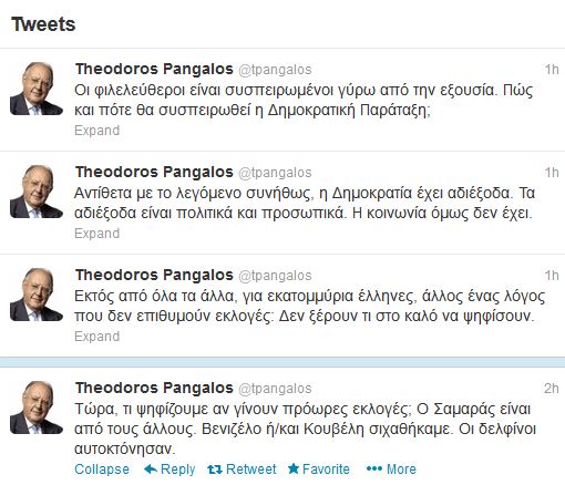 Χείμαρρος ήταν για ακόμα μία φορά ο Θεόδωρος Πάγκαλος. Με διαδοχικά tweets σχολιάζει τα σενάρια περί πρόωρων εκλογών και διερωτάται τι θα ψηφίσουμε σε μια τέτοια περίπτωση.
