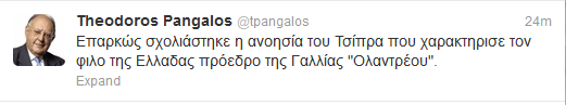 “Ανοησία” χαρακτηρίζει ο Θεόδωρος Πάγκαλος, τον χαρακτηρισμό του Αλέξη Τσίπρα για τον Γάλλο πρόεδρο, Φρανσουά Ολάντ -Ολαντρέου. “Επαρκώς σχολιάστηκς η ανοησία του Τσίπρα που χαρακτήρισε τον φίλο της Ελλάδα, πρόεδρο της Γαλλίας “Ολαντρέου” γράφει ο κ.Πάγκαλος στο twitter. Δείτε το tweet: