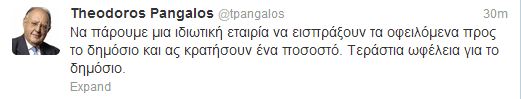 Ο Θεόδωρος Πάγκαλος κάνει μέσω του twitter τη δική του πρόταση για το πώς το ελληνικό δημόσιο θα εισπράξει τις οφειλές.