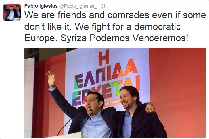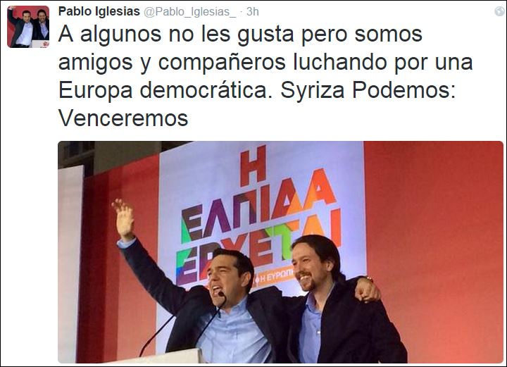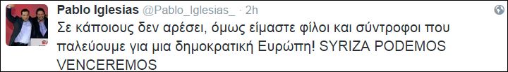 «Σε κάποιους δεν αρέσει, όμως είμαστε φίλοι και σύντροφοι που παλεύουμε για μια δημοκρατική Ευρώπη! SYRIZA PODEMOS VENCEREMOS», έγραψε ο Πάμπλο Ιγκλέσιας στο twitter.