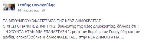 «Τα μπουμπουκοφασιστάκια της Νέας Δημοκρατίας. Ο Χριστογιάννης Δημήτρης, βουλευτής της Νέας Δημοκρατίας, δήλωσε ότι: “η χούντα ήταν μία επανάσταση,” μετά τον Βορίδη, τον Γεωργιάδη και τον Δένδια αποκαλύφθηκε κι άλλος φασίστας στη Νέα Δημοκρατία….», έγραψε ο κ. Παναγούλης στο facebook.