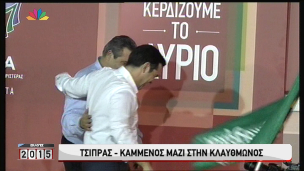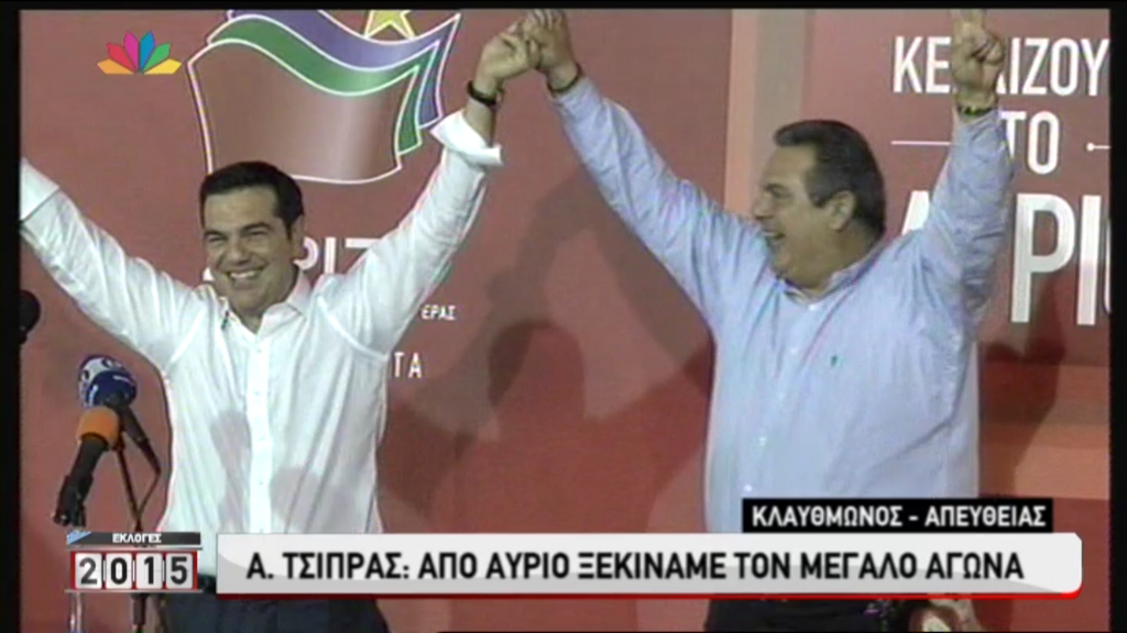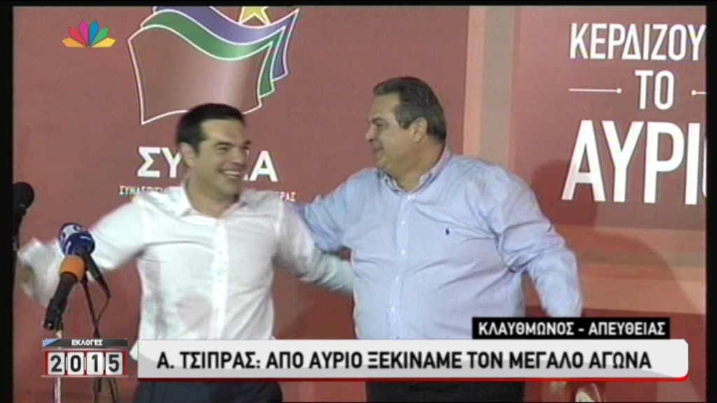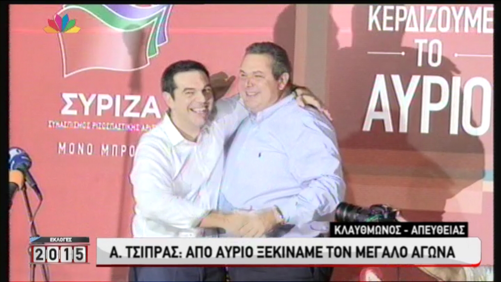 Τον Πρόεδρο των Ανεξαρτήτων Ελλήνων, Πάνο Καμμένο, ευχαρίστησε από την πλατεία Κλαυθμώνος, ο Αλέξης Τσίπρας. Όπως φαίνεται και στις φωτογραφίες αμέσως μετά ο κ. Καμμένος ανέβηκε στην εξέδρα που μιλούσε ο Πρόεδρος του ΣΥΡΙΖΑ, και πανηγύρισαν παρέα ενώ δεν έλειψαν και οι απαραίτητες αγκαλιές.