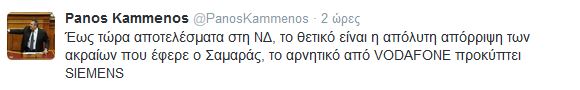 Ο κ.Καμμένος έγραψε στο Twitter: «Έως τώρα αποτελέσματα στη ΝΔ, το θετικό είναι η απόλυτη απόρριψη των ακραίων που έφερε ο Σαμαράς, το αρνητικό από VODAFONE προκύπτει SIEMENS».