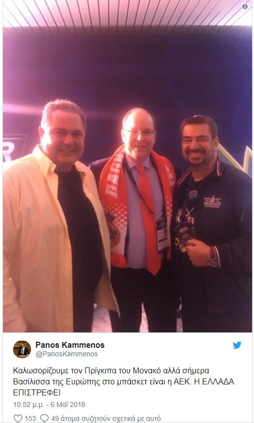 Μάλιστα, ο κ. Καμμένος είχε αναρτήσει φωτογραφία από τη συνάντηση τους στο προφίλ του στο Twitter αναφέροντας: «Καλωσορίζουμε τον Πρίγκιπα του Μονακό αλλά σήμερα βασίλισσα της Ευρώπης στο μπάσκετ είναι η ΑΕΚ. Η Ελλάδα επιστρέφει».Δείτε εκείνη την ανάρτηση: