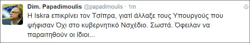 «Η Iskra επικρίνει τον Τσίπρα, γιατί άλλαξε τους Υπουργούς που ψήφισαν Όχι στο κυβερνητικό Νομοσχέδιο. Σωστά. Όφειλαν να παραιτηθούν οι ίδιοι…», έγραψε ο κ. Παπαδημούλης.
