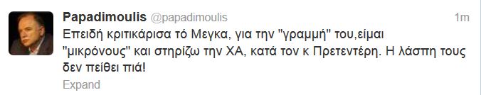 “Επειδή κριτικάρισα το Mega και τη “γραμμή” του είμαι “μικρόνους” και στηρίζω τη ΧΑ, κατά τον κ. Πρετεντέρη”, σχολιάζει στο twitter o βουλευτής του ΣΥΡΙΖΑ Δημήτρης Παπαδημούλης.