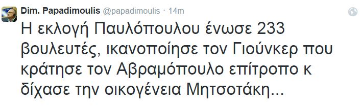 Την εκλογή του Προκόπη Παυλόπουλου στη θέση του Προέδρου της Δημοκρατίας, σχολίασε μέσω twitter ο Δημήτρης Παπαδημούλης, υπογραμμίζοντας ότι «δίχασε την οικογένεια Μητσοτάκη».
