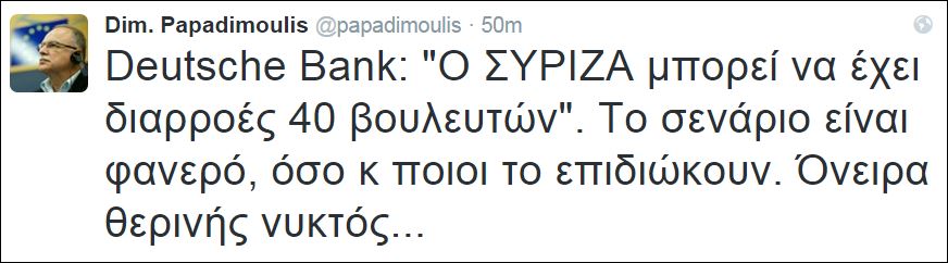 «Deutsche Bank: “Ο ΣΥΡΙΖΑ μπορεί να έχει διαρροές 40 βουλευτών”. Το σενάριο είναι φανερό, όσο κ ποιοι το επιδιώκουν. Όνειρα θερινής νυκτός…», έγραψε ο Δημήτρης Παπαδημούλης στο twitter.
