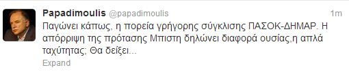 “Παγώνει κάπως, η πορεία γρήγορης σύγκλισης ΠΑΣΟΚ-ΔΗΜΑΡ. Η απόρριψη της πρότασης Μπίστη δηλώνει διαφορά ουσίας,η απλά ταχύτητας; Θα δείξει…”, ήταν το σχόλιο του κοινοβουλευτικού εκπροσώπου του ΣΥΡΙΖΑ.