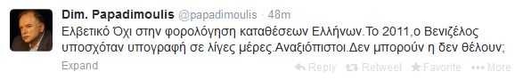Την άρνηση των Ελβετών να φορολογήσουν τις καταθέσεις των Ελλήνων, σχολίασε μέσω του προσωπικού του λογαριασμού στο twitter, ο Δημήτρης Παπαδημούλης. Ο βουλευτής του ΣΥΡΙΖΑ. Συγκεκριμένα, ο βουλευτής του ΣΥΡΙΖΑ, έκανε λόγο για «αναξιόπιστους» πολιτικούς ενώ αναρωτήθηκε αν «θέλουν» να βρουν λύση ή απλά «δεν μπορούν».