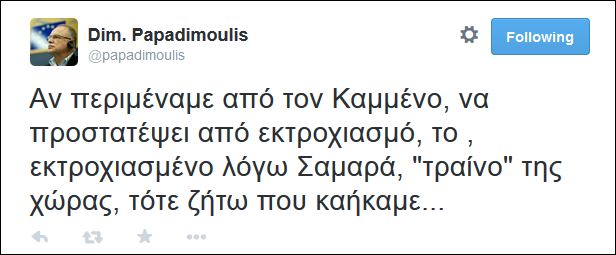 Κριτική στο προεκλογικό, τηλεοπτικό σποτ των Ανεξάρτητων Ελλήνων με πρωταγωνιστή τον Πάνο Καμμένο ασκεί ο Δημήτρης Παπαδημούλης με ανάρτηση στον προσωπικό του λογαριασμό στο Twitter. «Αν περιμέναμε από τον Καμμένο, να προστατέψει από εκτροχιασμό, το , εκτροχιασμένο λόγω Σαμαρά, “τραίνο” της χώρας, τότε ζήτω που καήκαμε…», αναφέρει το «τιτίβισμα» του ευρωβουλευτή του ΣΥΡΙΖΑ για το μήνυμα του σποτ των ΑΝΕΛ.