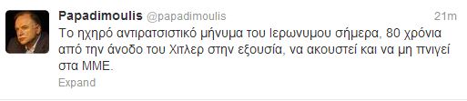 Συγκεκριμένα, ο κ. Παπαδημούλης , έγραψε το εξής: «Το ηχηρό αντιρατσιστικό μήνυμα του Ιερώνυμου σήμερα, 80 χρόνια μετά από την άνοδο του Χίτλερ στην εξουσία, να ακουστεί και να μην πνιγεί στα ΜΜΕ».