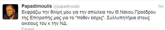 “Εκφράζω τη θλίψη μου για την απώλεια του Θ.Νάκου, Προέδρου της Επιτροπής μας για το “πόθεν έσχες”. Συλλυπητήρια στους οικείους του και την ΝΔ”, έγραψε στο twitter ο Δημήτρης Παπαδημούλης.
