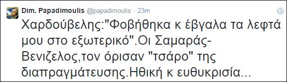 «Χαρδούβελης: “Φοβήθηκα και έβγαλα τα λεφτά μου στο εξωτερικό”. Οι Σαμαράς – Βενιζέλος, τον όρισαν “τσάρο” της διαπραγμάτευσης. Ηθική και ευθυκρισία…”, έγραψε χαρακτηριστικά στον προσωπικό του λογαριασμό στο twitter, ο Δημήτρης Παπαδημούλης, αναφερόμενος στον πρώην υπουργό Οικονομικών, Γκίκα Χαρδούβελη και την αποκάλυψη της Realnews για τα χρήματα που έβγαλε στο εξωτερικό.