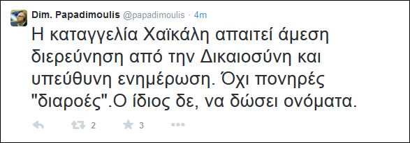 Να ονοματίσει τα πρόσωπα που εμπλέκονται στην υπόθεση απόπειρας χρηματισμού του καλεί τον Παύλο Χαϊκάλη ο Δημήτρης Παπαδημούλης με ανάρτηση στον προσωπικό του λογαριασμό στο Twitter. «Η καταγγελία Χαϊκάλη απαιτεί άμεση διερεύνηση από την Δικαιοσύνη και υπεύθυνη ενημέρωση. Όχι πονηρές “διαροές”.Ο ίδιος δε, να δώσει ονόματα», σχολιάζει ο ευρωβουλευτής του ΣΥΡΙΖΑ.