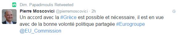 «Μία συμφωνία με την Ελλάδα είναι πιθανή και απαραίτητη, εναπόκειται στην καλή θέληση σύσσωμης της πολιτικής ηγεσίας», έγραψε στο twitter ο Πιέρ Μοσκοβισί.