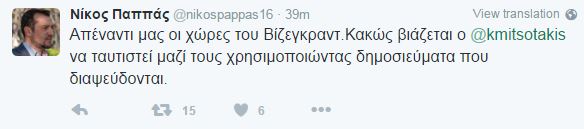 Μέσω του λογαριασμού του στο twitter σχολίασε ο υπουργός Επικρατείας Νίκος Παππάς, τη συνέντευξη του προέδρου της ΝΔ, Κυριάκου Μητσοτάκη στον Real Fm 97,8. Ο Παππάς υποστήριξε ότι ο κ. Μητσοτάκης “βιάζεται να ταυτιστεί με τις χώρες του Βίζεγκραντ”.