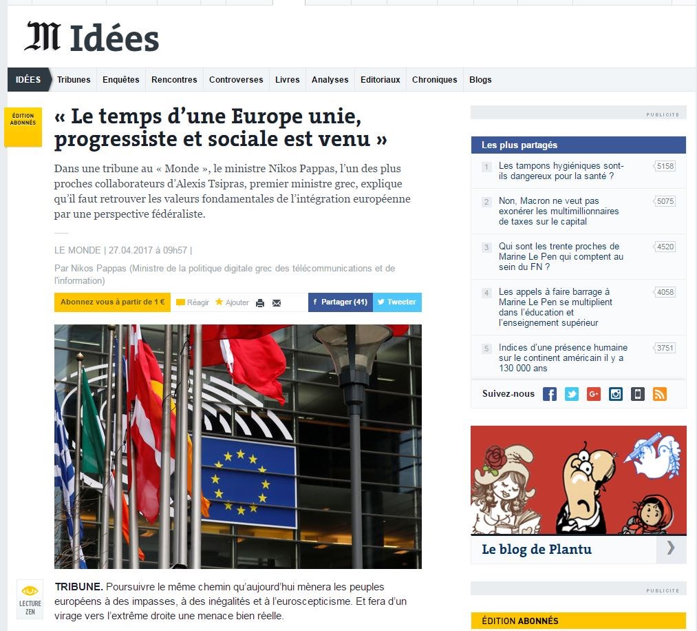 Άρθρο του υπουργού Ψηφιακής Πολιτικής, Τηλεπικοινωνιών και Ενημέρωσης, Νίκου Παππά, με θέμα τον αριστερό προοδευτικό φεντεραλισμό ως προωθητική δύναμη για την Ευρώπη, δημοσιεύει σήμερα η γαλλική εφημερίδα «Le Monde».Η «Le Monde» δημοσιεύει το άρθρο με τίτλο «Έχει έρθει ο καιρός για μια Ευρώπη ενωμένη, προοδευτική και κοινωνική» και το προλογίζει τονίζοντας ότι ο Νίκος Παππάς εξηγεί πώς πρέπει να ξαναβρούμε τις θεμελιώδεις αρχές της ευρωπαϊκής ενσωμάτωσης μέσα από το πρίσμα του φεντεραλισμού.Ακολουθεί το πλήρες κείμενο του άρθρου:Ο αριστερός προοδευτικός φεντεραλισμός θα είναι η προωθητική δύναμη για την ΕυρώπηΗ Ευρώπη είναι σε σταυροδρόμι.Η συνέχιση της πορείας στην ίδια κατεύθυνση θα επιτείνει τα αδιέξοδα, τις ανισότητες και τον ευρωσκεπτικισμό. Ταυτόχρονα η στροφή στα ακροδεξιά είναι μία υπαρκτή απειλή.Και αν είναι έτσι, ποια λύση πρέπει να προκρίνουν οι αριστερές και προοδευτικές δυνάμεις;Ποιες πολιτικές και ποιες προτεραιότητες μπορούν να επαναθεμελιώσουν το μεγάλο ιστορικό πείραμα της ενωμένης ευρώπης και να αναζωογονήσουν την πίστη των ευρωπαικών λαών σε αυτό;Η απάντηση σε αυτό το θεμελιακό ερώτημα προϋποθέτει πολιτική τόλμη και στρατηγική διαύγεια. Απαιτεί να προσδιορίσουμε ποια Ευρώπη θέλουμε ως πολίτες που πίστευαν πάντα (ή και αυτοί που το διαπίστωσαν τελευταία), ότι το «αόρατο χέρι της αγοράς» δεν μπορεί να παράγει τις βέλτιστες κοινωνικές και οικονομικές λύσεις.Η Ευρωπαϊκή Ένωση είναι πολιτικά αποδυναμωμένη και τραυματισμένη στη συνείδηση των πολιτών. Σε όλα τα δημοψηφίσματα που διεξήχθησαν τα τελευταία χρόνια η πρόταση που υποστήριζαν οι κυρίαρχες πολιτικές δυνάμεις απορρίφθηκε. Οι φυγόκεντρες τάσεις δεν περιορίζονται στο Λονδίνο, ενώ η προσφυγική κρίση έδειξε ότι σε αρκετές πρωτεύουσες της ηπείρου τα ευρωπαϊκά κεκτημένα δεν θεωρούνται πια δεδομένα.Η σύγχρονη Αριστερά, σοσιαλιστική ή ριζοσπαστική, δεν επιχαίρει με αυτά τα προβλήματα.Αντίθετα, τα αδιέξοδα μπροστά στα οποία βρίσκεται η ευρωπαϊκή ενοποίηση είναι καμπανάκι κινδύνου και κίνητρο πολιτικού αγώνα για την υπεράσπιση του ευρωπαϊκού οράματος, μέσα από την προοδευτική επαναθεμελίωση του.Γιατί η Ευρώπη εξακολουθεί να είναι για μας το «κοινό σπίτι των λαών της», και επίσης η ελάχιστη γεωγραφική και πολιτική περιοχή μέσα στην οποία οι κυβερνήσεις, η πολιτική, η Αριστερά μπορούν να ανασχέσουν την επιθετική ατζέντα των χρηματαγορών.Ο πυρήνας των σημερινών αδιεξόδων είναι η αποτυχία των επί 20 χρόνια κυρίαρχων πολιτικών στην Ευρώπη. Των πολιτικών που εφάρμοσαν συγκλίνουσες δυνάμεις των συντηρητικών με τμήμα της σοσιαλδημοκρατίας πάνω στο έδαφος του νεοφιλελευθερισμού. Αυτές οι πολιτικές αποξένωσαν τους πολίτες, συμπίεσαν την κοινωνία, μεγάλωσαν τις οικονομικές ανισότητες και τις ανισότητες μεταξύ των χωρών. Έδωσαν χώρο και ακροατήριο στον εθνικισμό και τις μισαλλόδοξες αντιλήψεις.Σε ένα άλλο επίπεδο αλλά πάλι εξαιτίας αυτών των πολιτικών, η Ευρώπη σαν σύνολο έμεινε στάσιμη δηλαδή στην ουσία έχασε πολύτιμο έδαφος. Νέοι δυναμικοί παίκτες στη διεθνή σκηνή αποσπούν αγορές, συγκεντρώνουν τις νέες επενδύσεις σε κεφάλαιο και ενσωματώνουν με πιο γοργούς ρυθμούς την γνώση και την τεχνολογία στην παραγωγή τους. Δεν πρέπει να επιτρέψουμε στην Ευρώπη να γεράσει και να περιθωριοποιηθεί.Η αντιστροφή αυτής της τριπλής κρίσης – δημοκρατικής νομιμοποίησης