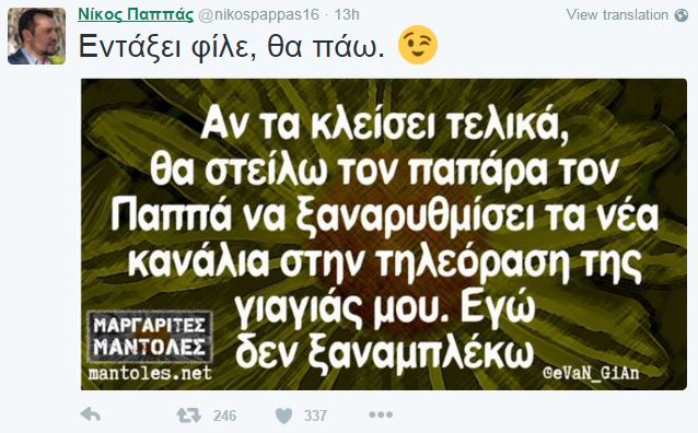 Απάντηση σε ένα χιουμοριστικό «τρολάρισμα» για τον ίδιο και το θέμα των τηλεοπτικών αδειών έδωσε ο υπουργός Επικρατείας, Νίκος Παππάς, μέσα από τον προσωπικό του λογαριασμό στο twitter.