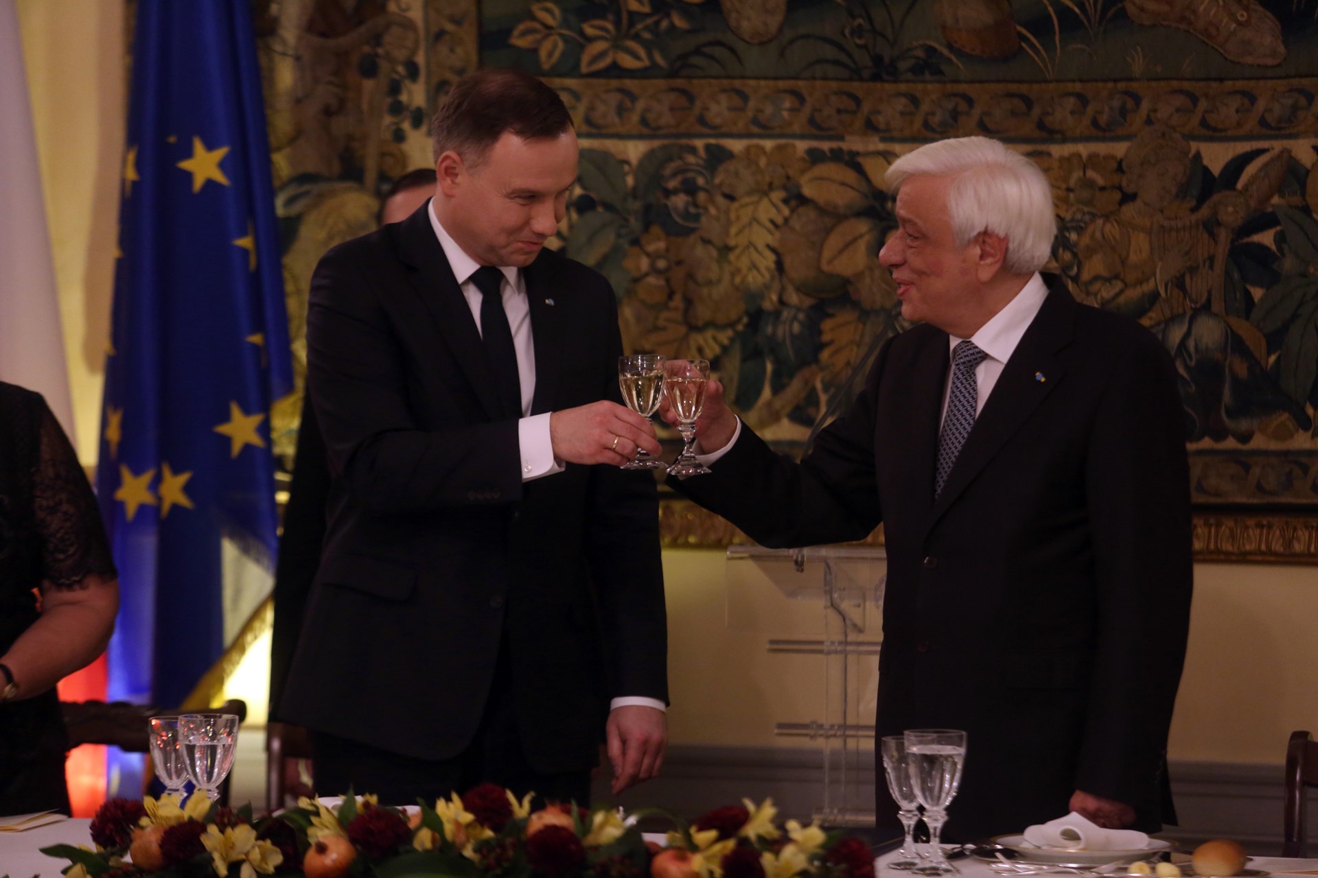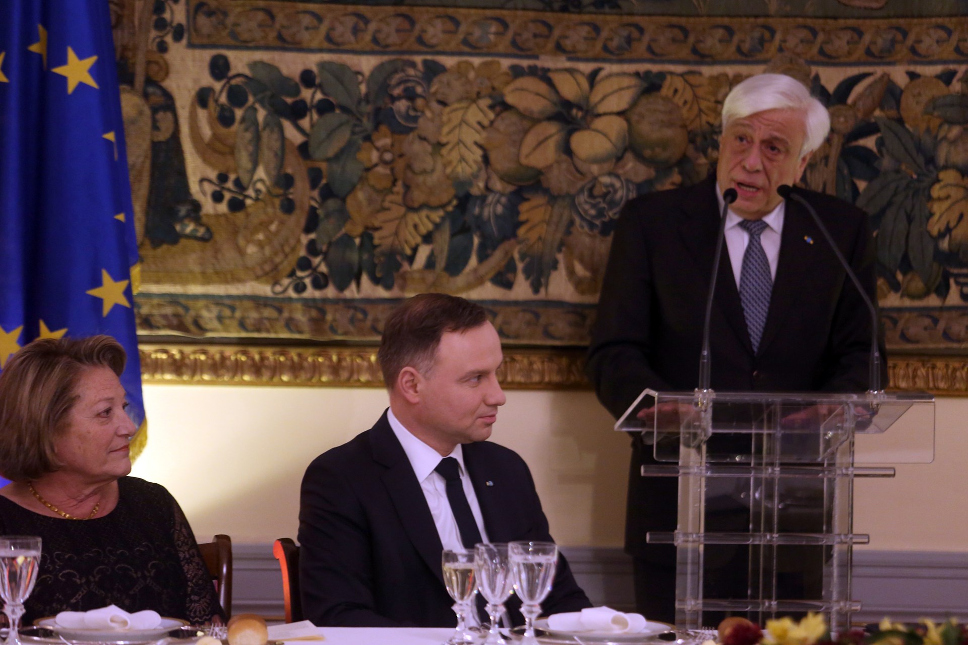 Την συνέπεια με την οποία Ελλάδα και Πολωνία ακολουθούν τον ευρωπαϊκό τους δρόμο και υπερασπίζονται το ευρωπαϊκό μέλλον, έχοντας ως όραμα μια ισχυρότερη Ευρωπαϊκή Ένωση, χωρίς να «ταξιδεύουν» με «πηδάλια» ιδιοτέλειας, πολύ δε περισσότερο με «σημαίες ευκαιρίας» τόνισε ο Πρόεδρος της Δημοκρατίας Προκόπης Παυλόπουλος κατά την προσφώνησή του, στο επίσημο δείπνο που παρέθεσε προς τιμήν του Πολωνού ομολόγου του Άντρζεϊ Ντούντα στο Προεδρικό Μέγαρο.