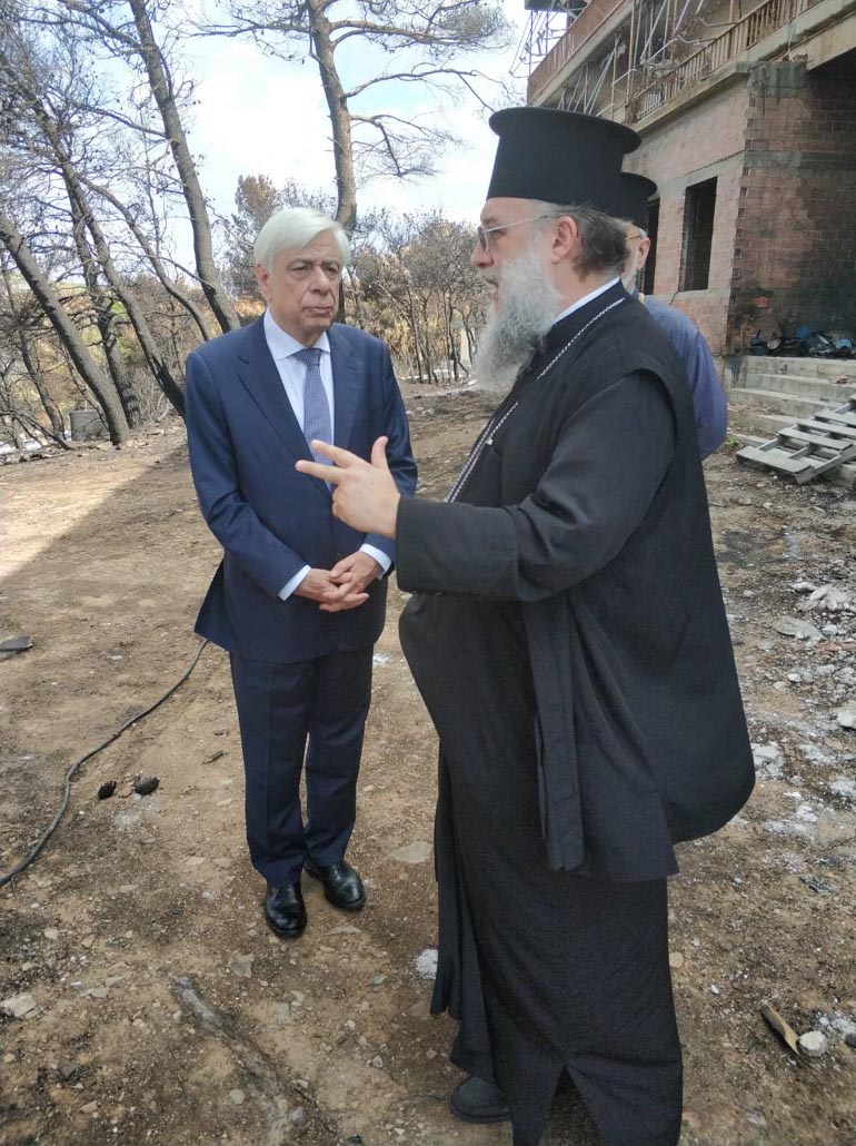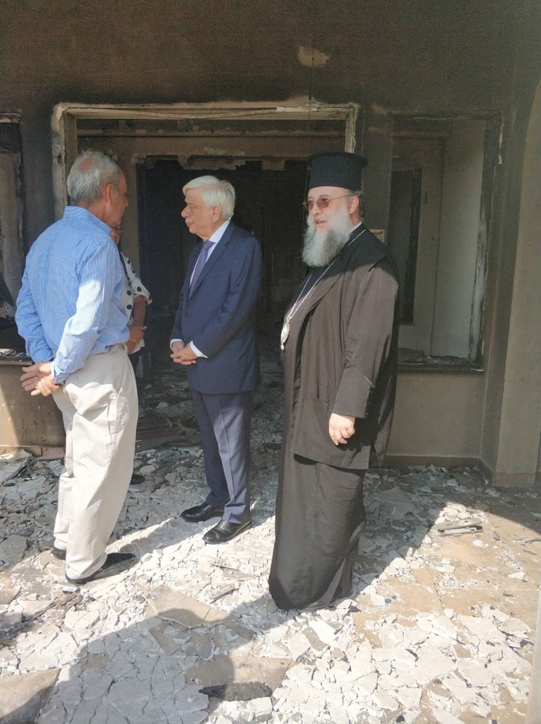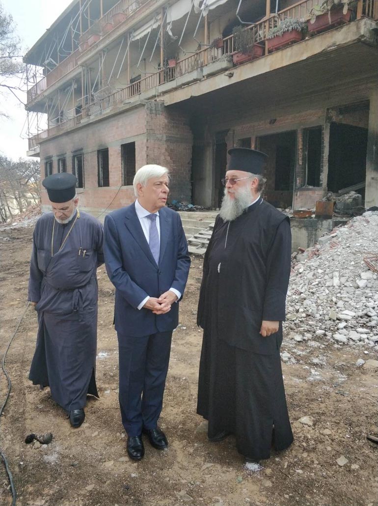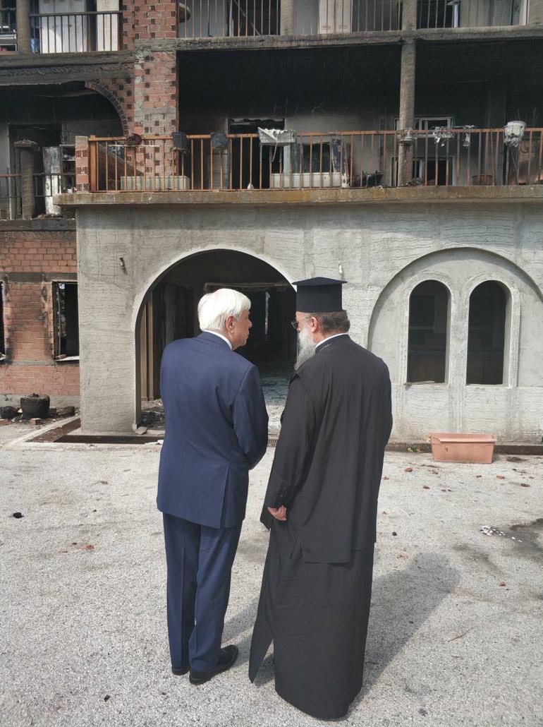 Τον κ. Παυλόπουλο υποδέχθηκαν και ξενάγησαν στους κατεστραμμένους χώρους της Μονής και του Παιδικού Ιδρύματος ο Μητροπολίτης Κηφισιάς, Αμαρουσίου και Ωρωπού Κύριλλος, η ηγουμένη και οι μοναχές.
