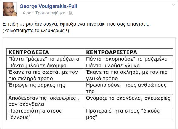 Ένα πίνακα με τις διαφορές μεταξύ της κεντροδεξιάς και της κεντροαριστεράς έφτιαξε ο Γιώργος Βουλγαράκης.