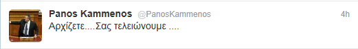 “Αρχίζετε…Σας τελειώνουμε…”, έγραψε ο Πάνος Καμμένος στο Twitter, απαντώντας έτσι στο σύνθημα του ΠΑΣΟΚ για τις εσωκομματικές εκλογές, που αποστέλλεται και ως SMS στους φίλους και τα μέλη του κινήματος: “Tην Κυριακή αρχίζουμε”.