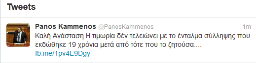 Δείτε τι έγραψε ο πρόεδρος των Ανεξάρτητων Ελλήνων, Πάνος Καμμένος στο twitter για τη σύλληψη του Άκη Τσοχατζόπουλου:”Καλή Ανάσταση” εύχεται αρχικά ο κ.Καμμένος μέσω του twitter επισημαίνοντας στη συνέχεια ότι “Η τιμωρία δεν τελειώνει με το ένταλμα σύλληψης που εκδόθηκε 19 χρόνια μετά από τότε που το ζητούσα”: