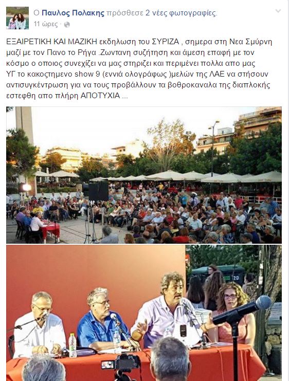 Την ένταση που σημειώθηκε στη χθεσινή εκδήλωση του ΣΥΡΙΖΑ, στη Νέα Σμύρνη, με ομιλητές τον Παύλο Πολάκη και τον Πάνο Ρήγα, σχολίασε με ανάρτηση στον προσωπικό του λογαριασμό στο Facebook, ο αναπληρωτής υπουργός Υγείας Παύλος Πολάκης.
