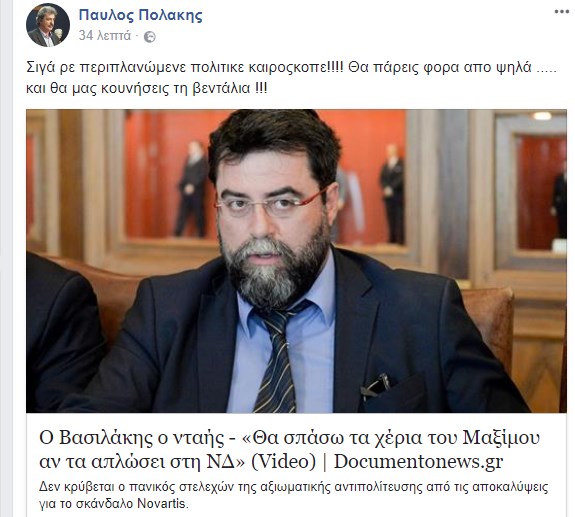 “Σιγά ρε περιπλανώμενε πολιτικέ καιροσκόπε !!!! Θα πάρεις φόρα από ψηλά ….. και θα μας κουνήσεις τη βεντάλια !!!” έγραψε ο κ. Πολάκης στο Facebook.